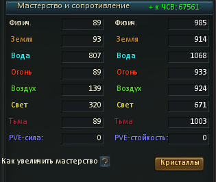Содержит информацию о показателях мастерства и сопротивления персонажей, PvE-силы и стойкости, а также кнопку доступа к таблице кристаллов сопротивления.