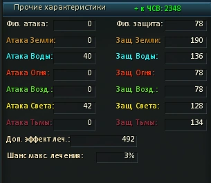Раздел характеристик находится в информационном разделе и содержит в себе информацию о количестве и здоровье, защите и силе атаки, меткости и уклоне, критическом и критическом уклонении.