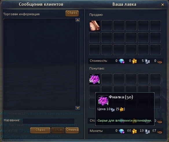 Нижняя область "Покупаю" заполняется теми товарами, которые вы хотели бы скупить: точно так же вы указываете цену, по которой (поштучно) собираетесь скупать тот или иной объект. Единовременно скупать можно так же 18 разных позиций.