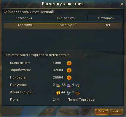 Но сумма, которую нам надо достичь, всегда одна - 100 000 Меркуриев. Безусловно, можно и не достигать данной суммы, главное покрыть свои расходы - то есть получить прибыль, однако, в этом случае награда будет значительно ниже, но мы-то помним: чем больше будет наша прибыль, тем больше нумий, а в случае гильдийского Торгового поручения, заслуг гильдии нам дадут.