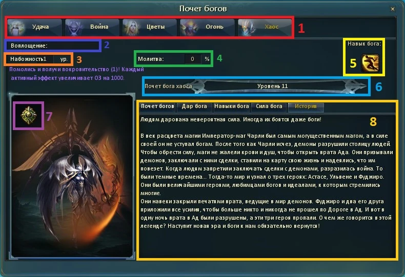 - Вкладки с разной информацией о выбраном боге. Как получить очки почета, список всех пассивных навыков покровительства, информация об активных навыках выбранного бога, требования для получения возможности воплощения и краткая история выбранного бога.