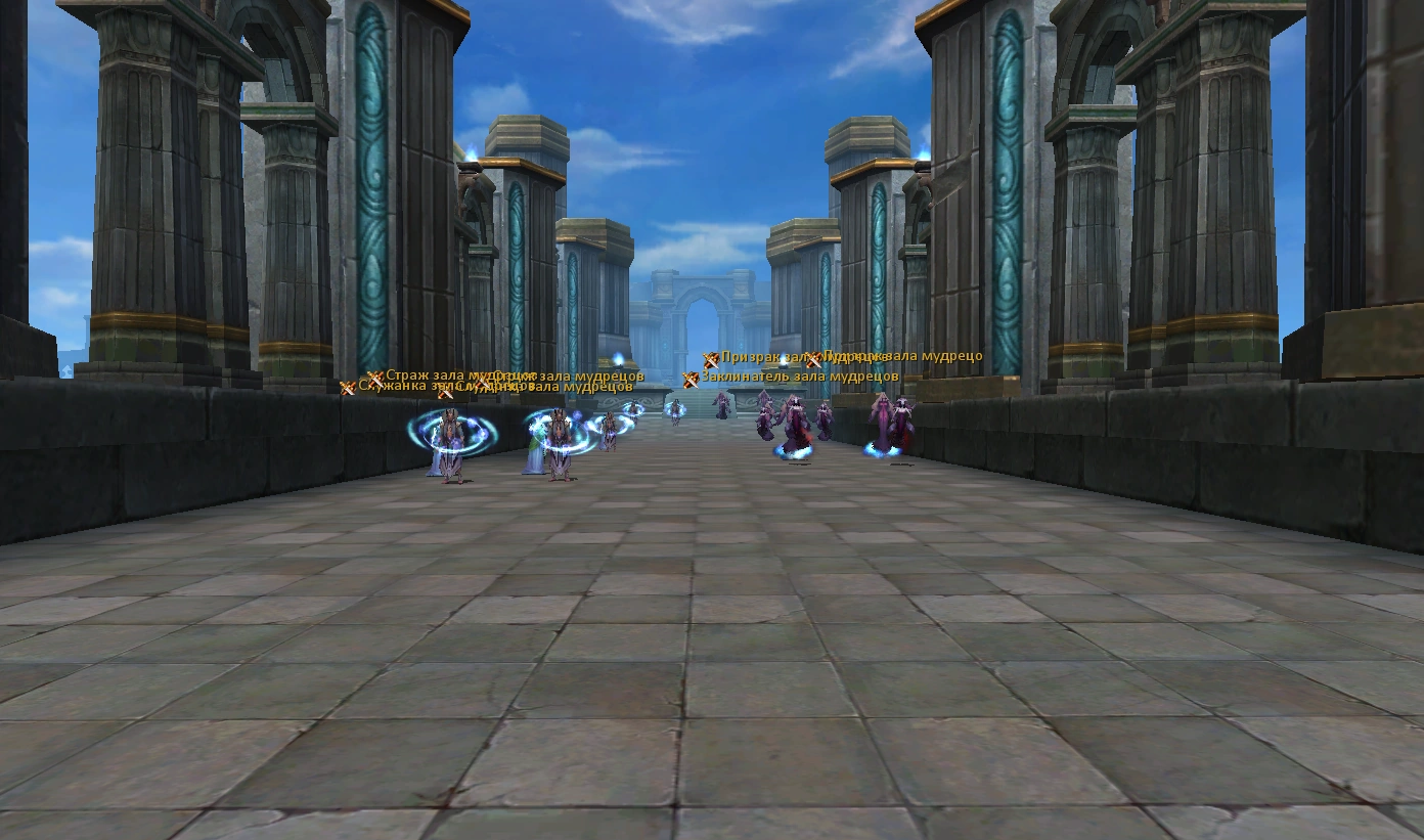 После убийства босса нужно пройти по длинному коридору, в котором стоят мобы группами по четыре штуки. Группы располагаются в шахматном порядке, поэтому персонажу с дальней атакой не составит труда сагрить только одного, двух или всю группу сразу, не тревожа других мобов. В каждой группе два типа мобов, например два стража и две служанки, т.е. если сагрить всю группу целиком, персонаж не умрёт от наложенных на него "печатей".