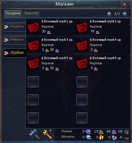 После того, как мы изучим профессию, нам необходимо купить соответствующий рецепт, без которого создание вещей будет для нас невозможным. Купить любой интересующий нас рецепт на создание аксессуара зеленого качества можно у Хаанделе в первой вкладке "Рецепты". Соответственно, вкладка "Особое" предоставляет нам выбор рецептов на создание Военных гербов.