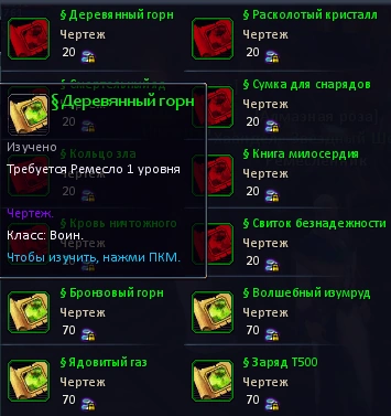 Изучив только что купленный рецепт, мы можем открыть окно изученных профессий (О(Щ) по умолчанию) и, дважды щелкнув по значку профессии Ремесленника увидеть перед собой окно производства, в котором представлены все изученные нами рецепты ремесла.