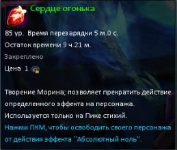 "Абсолютный ноль" - дебафф, суммирующийся до 50 раз, с каждым стаком увеличивает получаемый персонажем урон от воды и шанс крит. удара на 1%, но снижает скорость передвижения. При накоплении 50 стаков персонаж получает огромное количество урона и сразу же умирает. С помощью "Сердца огонька" можно избавиться от всех стаков "Абсолютного нуля".