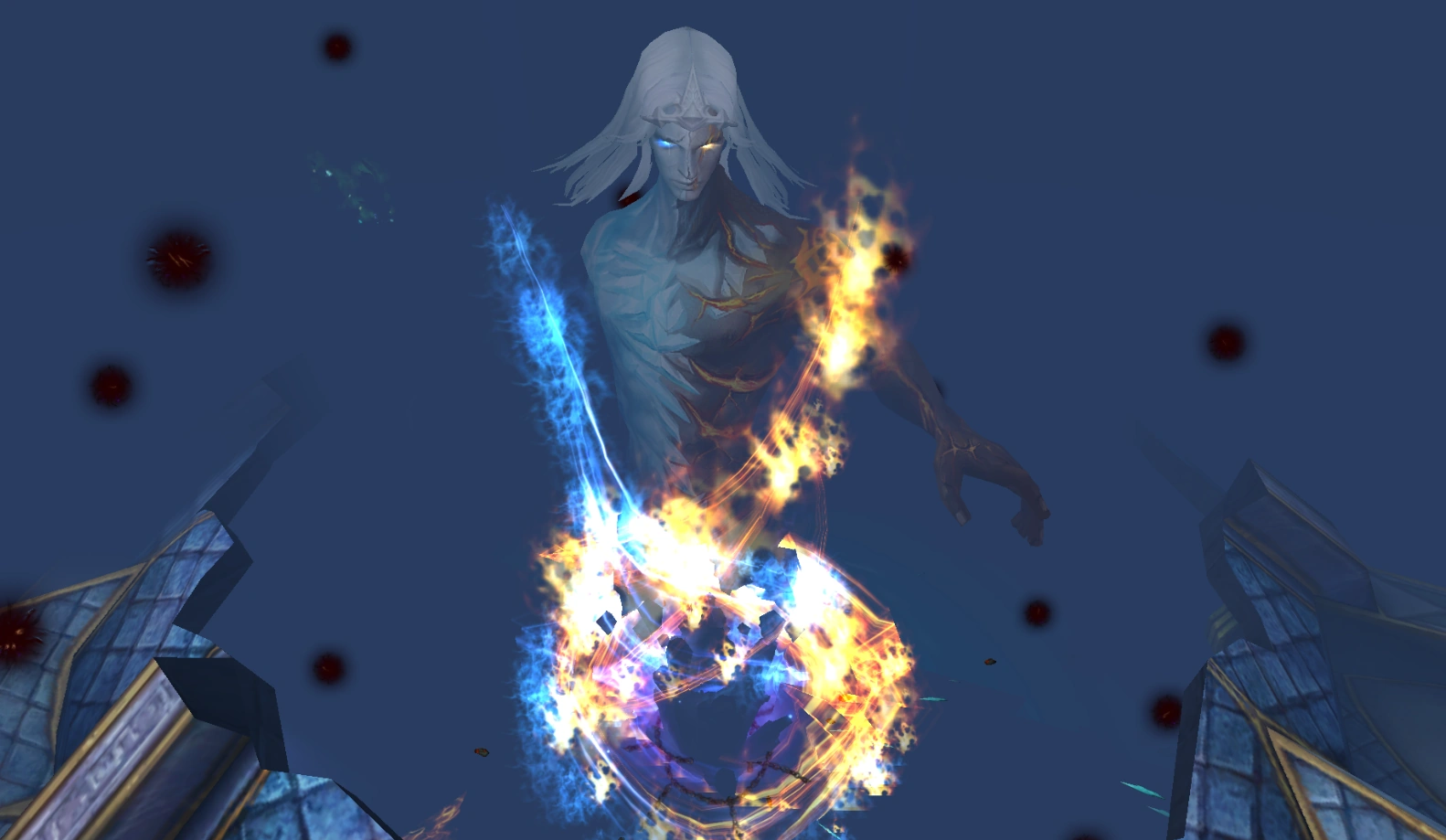 При 50% здоровья и ниже появится " Всплеск стихий" - летящие из босса в разные стороны ледяные и каменные осколки. Наносят урон в размере ~10% здоровья персонажа, запрещают использовать навыки, а также восстанавливают 25% максимальной маны. Чтобы избежать действия эффекта, нужно изменить высоту полёта.