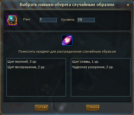 В появившееся окно также следует поместить Оберег покоя. Слева будут отображаться навыки, открытые на нём (или навык, если он один), а в правой части окна - результат изменения. Для каждой попытки требуется предмет: