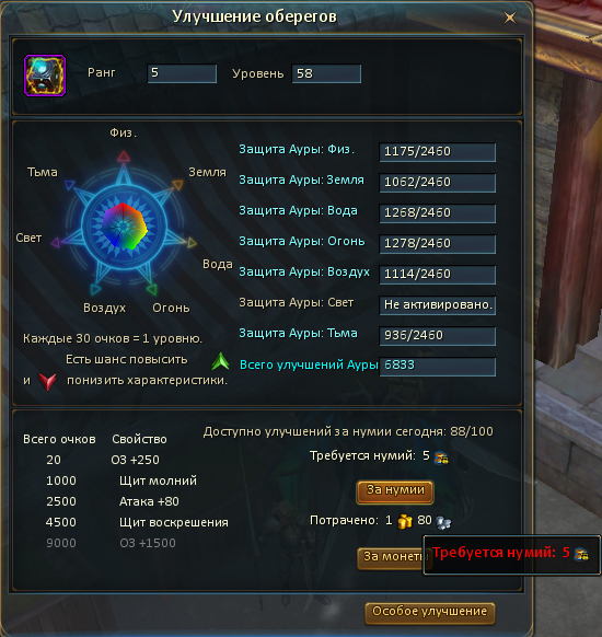 И наконец последний способ улучшения оберега - гарантированный. Расставляя плюсики в таком режиме можно гарантировано улучшить те или иные силы ауры на одну единицу. Однако это не дешёвое удовольствие, за один "клик" придётся заплатить 15 золотых монет в Обереге ярости и 7.5 - в Обереге покоя.
