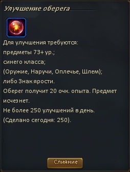 Слияние проводится прямо в интерфейсе Оберега. Для того, чтобы произвести слияние, необходимо поместить в слот для слияния (блок "Улучшение оберега") снаряжение синего качества либо Знак покоя или ярости.