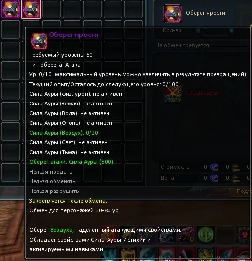 Обратите внимание, что начиная с третьего ранга Оберег теряет уровень при увеличении ранга. При этом снижается уровень требуемого снаряжения для слияния, а также требуемый опыт для увеличения уровня.