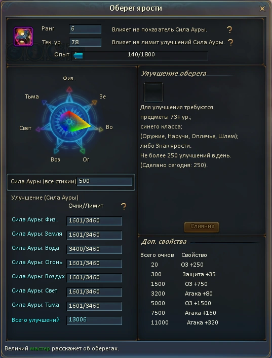 Текущий уровень Оберега можно посмотреть в окошке "Тек. ур.". От уровня зависят пределы увеличения силы ауры всех стихий. Уровень Оберега можно поднять, заполняя полоску "Опыт", а она в свою очередь заполняется от слияния с оберегом синего снаряжения или Знаков покоя и Знаков ярости.