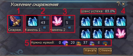 В окошке для простых камней (2) отображается количество имеющихся у вас в инвентаре соответствующих камней. Аналогично для улучшенных камней (3).