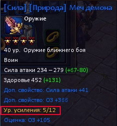 - Максимальный уровень заточки в игре - 12. Но некоторые вещи (обычно низкого уровня) имеют более низкий ранг для заточки (3 или 9). Наведя мышкой на предмет, можно посмотреть какой уровень заточки сейчас есть и каков максимально доступный.