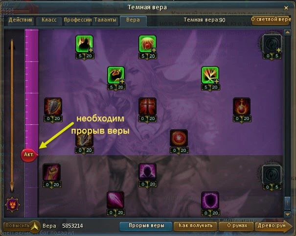 в главном меню). В окне веры можно не только просмотреть количество очков веры, но и повысить ее уровень, прокачать таланты веры и произвести различные операции с рунами.