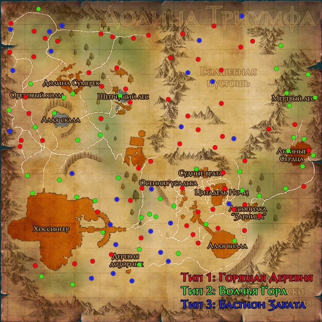 Зайти в алые сумерки можно через любого из них, но выбор НПС однозначно определяет вид похода. На карте справа изображены все возможные точки появления гонцов, цветом обозначен вид, в который они телепортируют Вас. Все точки одновременно не могут быть заняты, но гонцов за пределами этих точек не найти.